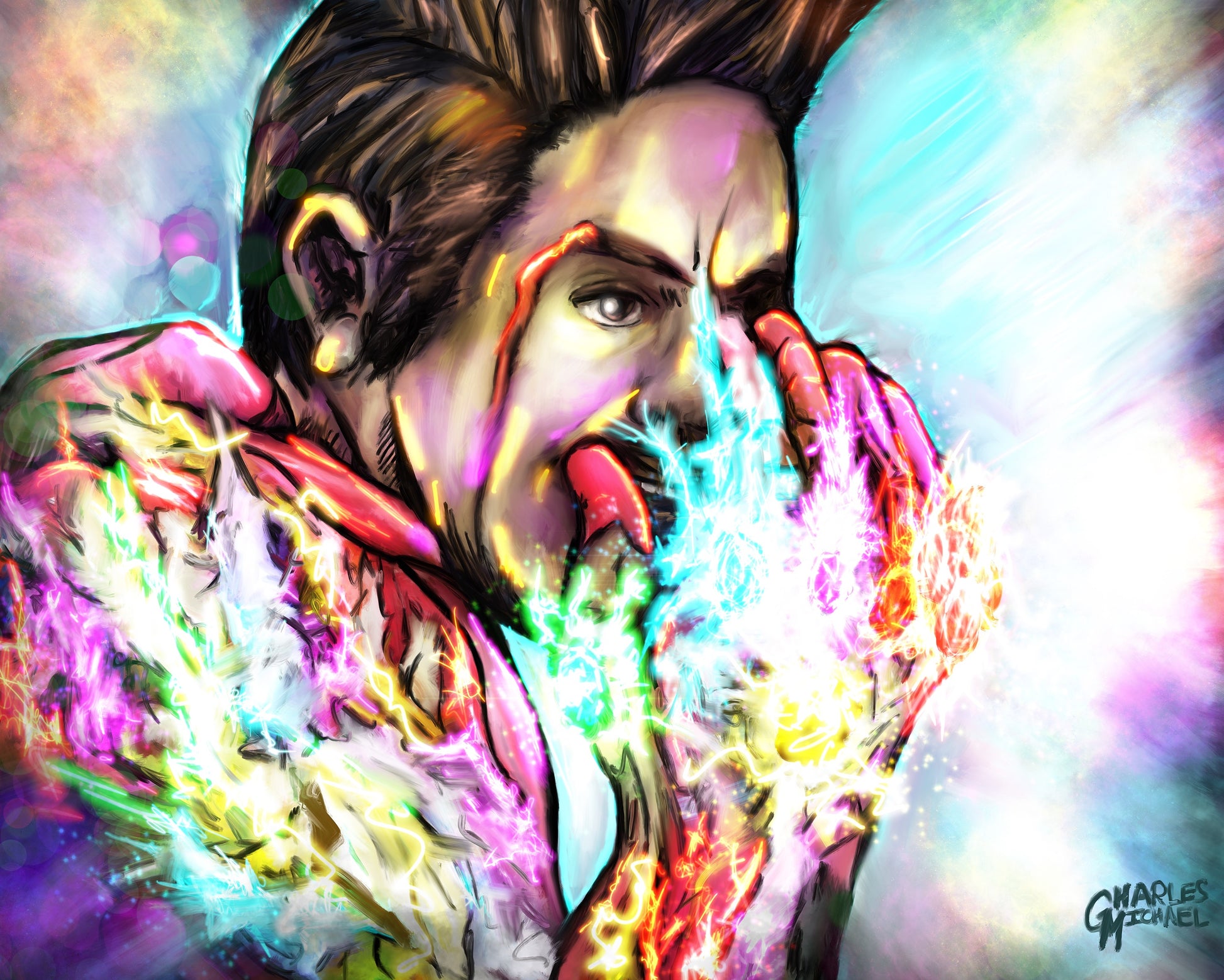 Holographic Poster - Printed on 8.5"x11" 130lb. Cardstock, these posters are dipped in holographic foil prior to printing. This enhances all of the darker tones in each painting (especially the line art), bringing subtle shards of iridescent colors when hit with direct light. This lighting can be either from direct sunlight or an LED light. Avoid displaying in rooms that are damp or generate moisture.