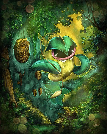 Holographic Poster - Printed on 8.5"x11" 130lb. Cardstock, these posters are dipped in holographic foil prior to printing. This enhances all of the darker tones in each painting (especially the line art), bringing subtle shards of iridescent colors when hit with direct light. This lighting can be either from direct sunlight or an LED light. Avoid displaying in rooms that are damp or generate moisture.