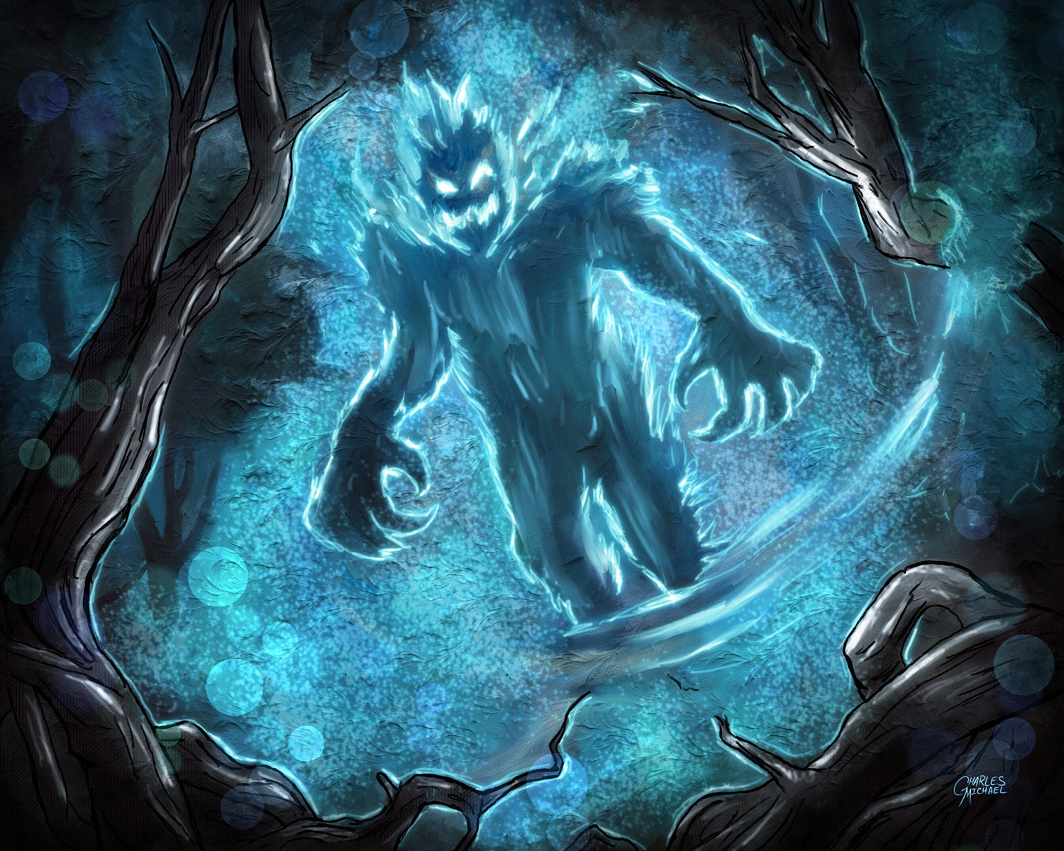 Holographic Poster - Printed on 8.5"x11" 130lb. Cardstock, these posters are dipped in holographic foil prior to printing. This enhances all of the darker tones in each painting (especially the line art), bringing subtle shards of iridescent colors when hit with direct light. This lighting can be either from direct sunlight or an LED light. Avoid displaying in rooms that are damp or generate moisture.
