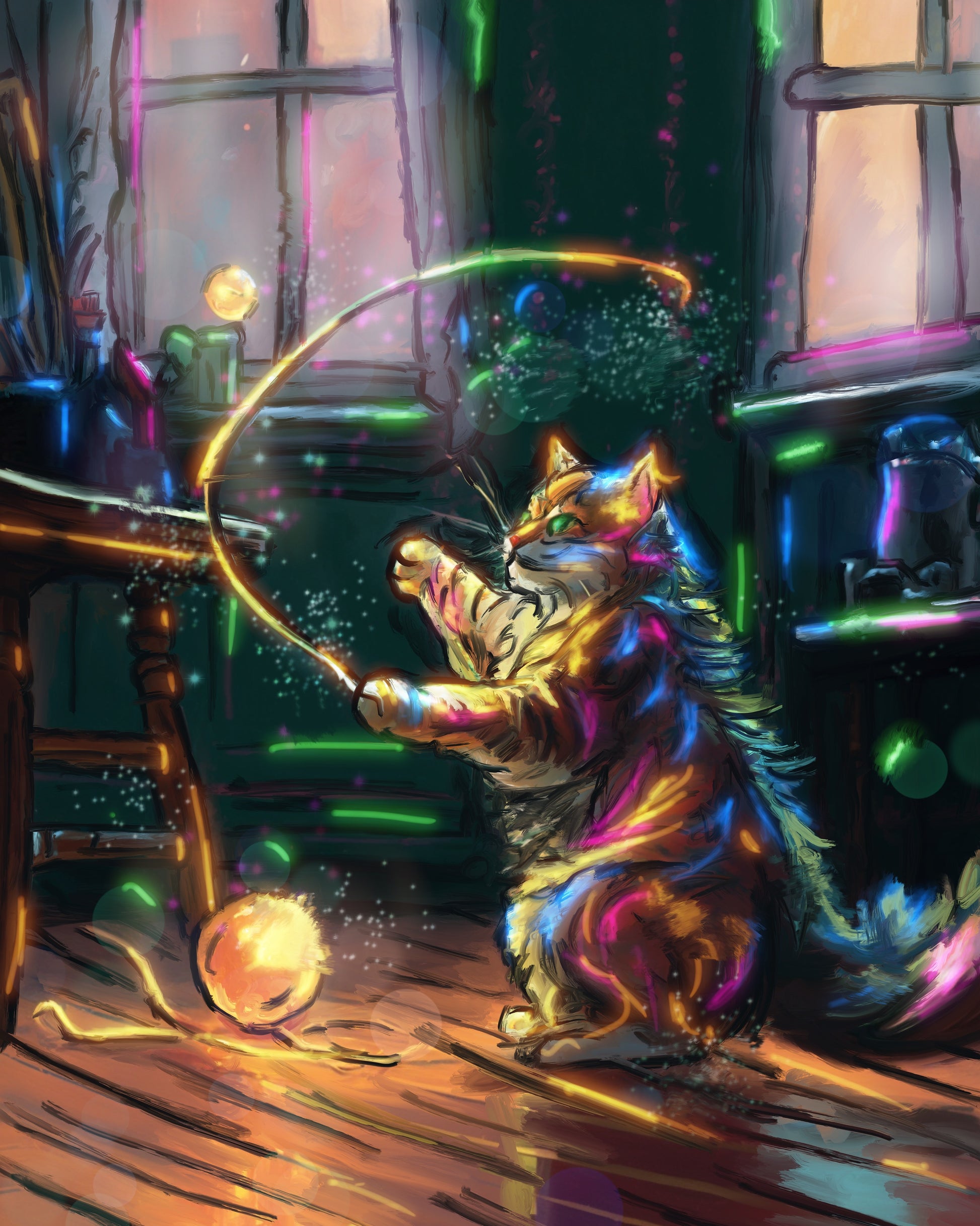 Holographic Poster - Printed on 8.5"x11" 130lb. Cardstock, these posters are dipped in holographic foil prior to printing. This enhances all of the darker tones in each painting (especially the line art), bringing subtle shards of iridescent colors when hit with direct light. This lighting can be either from direct sunlight or an LED light. Avoid displaying in rooms that are damp or generate moisture.