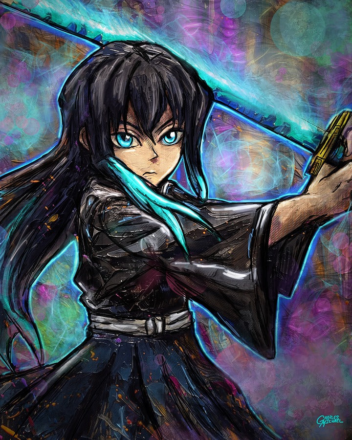 Holographic Poster - Printed on 8.5"x11" 130lb. Cardstock, these posters are dipped in holographic foil prior to printing. This enhances all of the darker tones in each painting (especially the line art), bringing subtle shards of iridescent colors when hit with direct light. This lighting can be either from direct sunlight or an LED light. Avoid displaying in rooms that are damp or generate moisture.