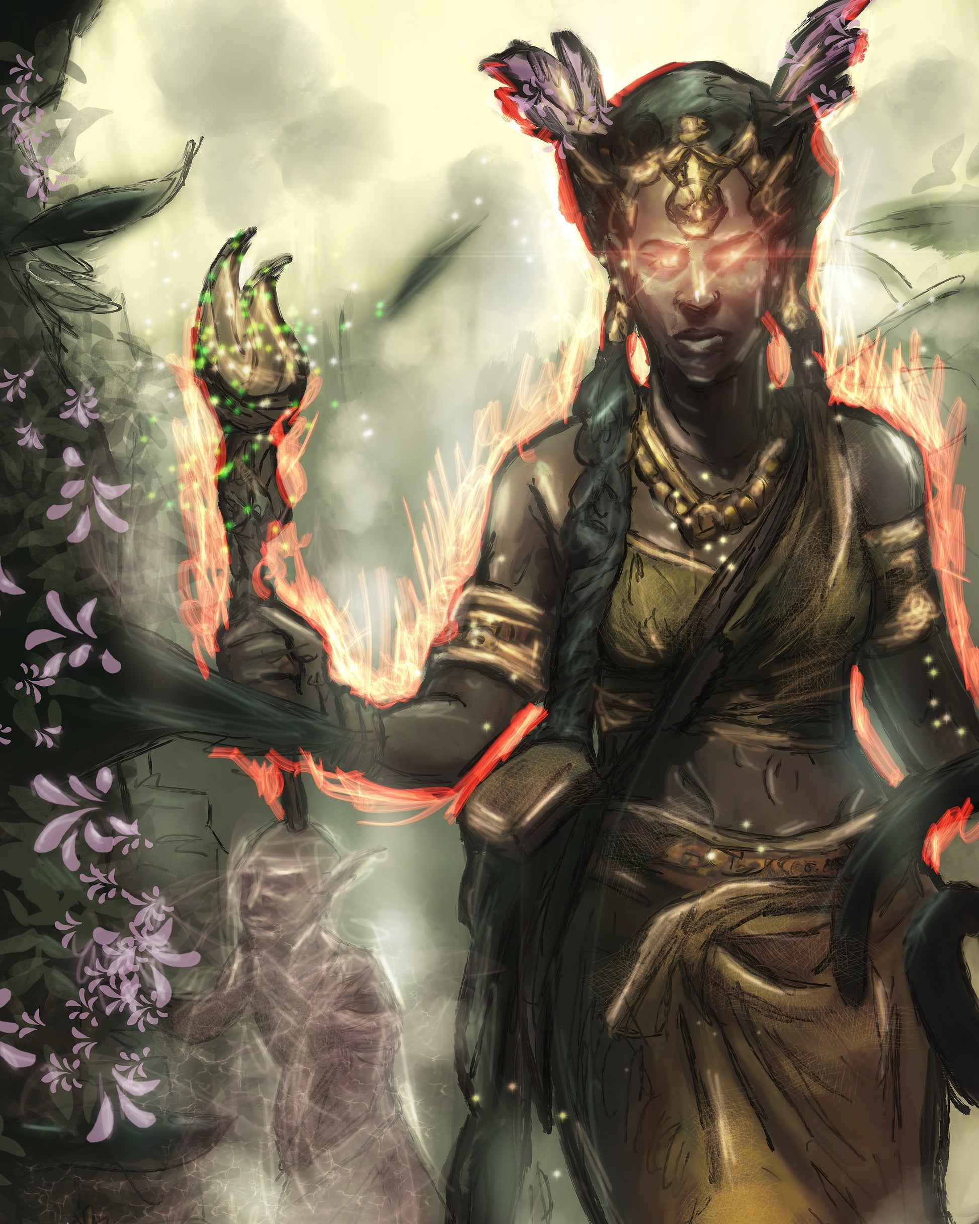 Holographic Poster - Printed on 8.5"x11" 130lb. Cardstock, these posters are dipped in holographic foil prior to printing. This enhances all of the darker tones in each painting (especially the line art), bringing subtle shards of iridescent colors when hit with direct light. This lighting can be either from direct sunlight or an LED light. Avoid displaying in rooms that are damp or generate moisture.