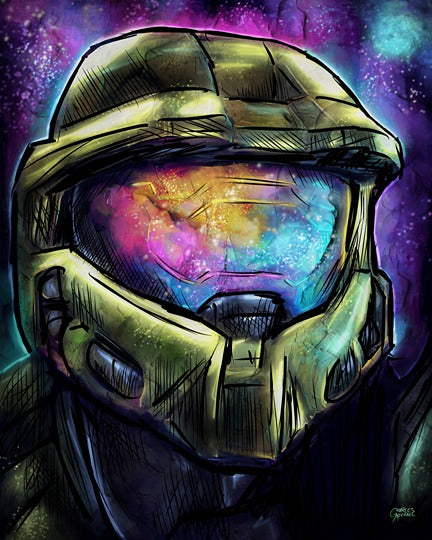 Holographic Poster - Printed on 8.5"x11" 130lb. Cardstock, these posters are dipped in holographic foil prior to printing. This enhances all of the darker tones in each painting (especially the line art), bringing subtle shards of iridescent colors when hit with direct light. This lighting can be either from direct sunlight or an LED light. Avoid displaying in rooms that are damp or generate moisture.