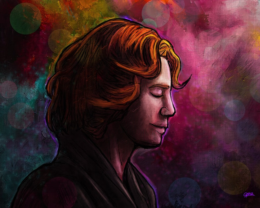 Holographic Poster - Printed on 8.5"x11" 130lb. Cardstock, these posters are dipped in holographic foil prior to printing. This enhances all of the darker tones in each painting (especially the line art), bringing subtle shards of iridescent colors when hit with direct light. This lighting can be either from direct sunlight or an LED light. Avoid displaying in rooms that are damp or generate moisture.