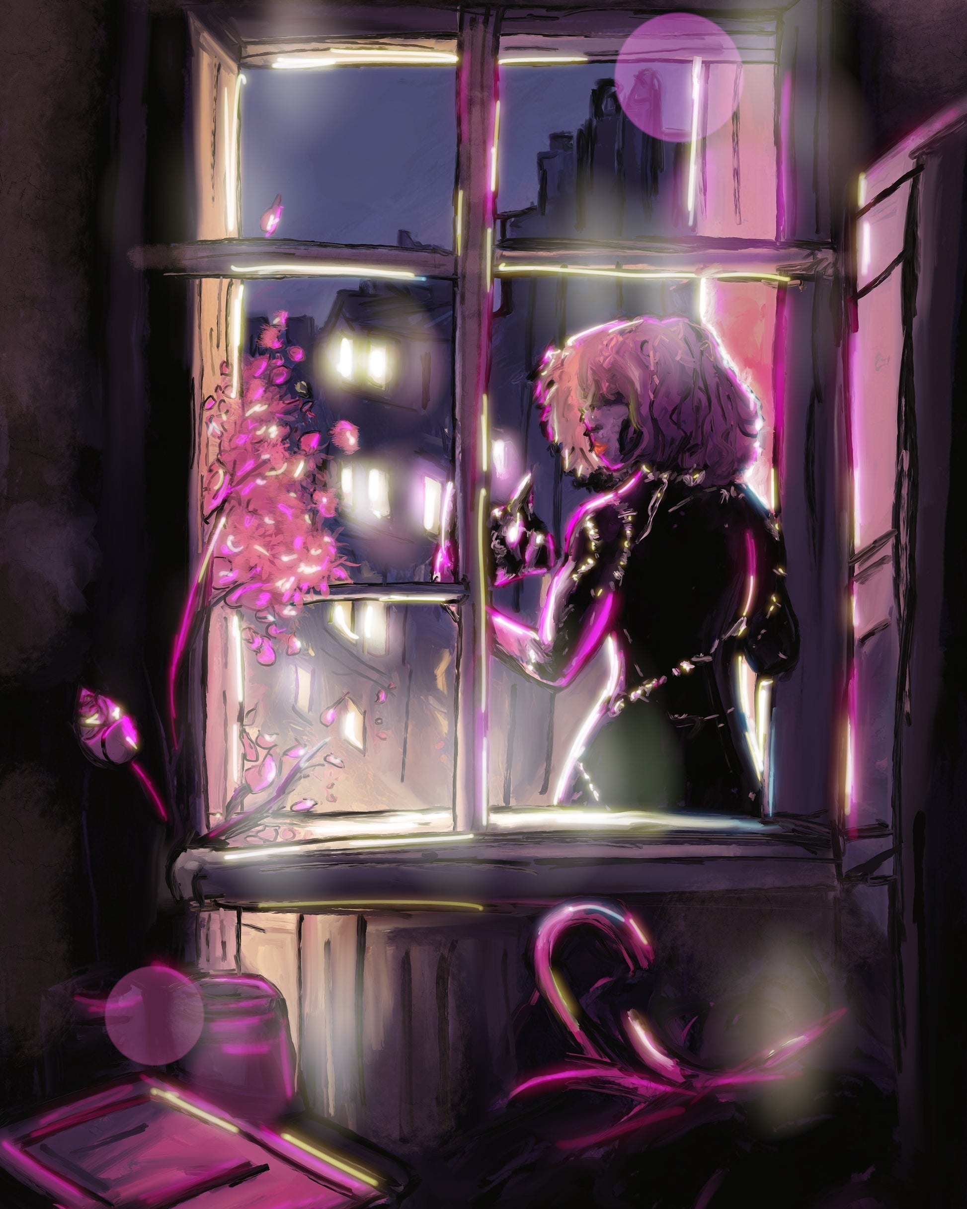 Holographic Poster - Printed on 8.5"x11" 130lb. Cardstock, these posters are dipped in holographic foil prior to printing. This enhances all of the darker tones in each painting (especially the line art), bringing subtle shards of iridescent colors when hit with direct light. This lighting can be either from direct sunlight or an LED light. Avoid displaying in rooms that are damp or generate moisture.
