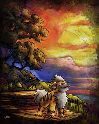 Holographic Poster - Printed on 8.5"x11" 130lb. Cardstock, these posters are dipped in holographic foil prior to printing. This enhances all of the darker tones in each painting (especially the line art), bringing subtle shards of iridescent colors when hit with direct light. This lighting can be either from direct sunlight or an LED light. Avoid displaying in rooms that are damp or generate moisture.