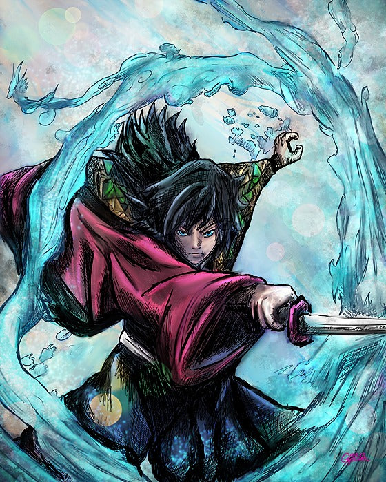 Holographic Poster - Printed on 8.5"x11" 130lb. Cardstock, these posters are dipped in holographic foil prior to printing. This enhances all of the darker tones in each painting (especially the line art), bringing subtle shards of iridescent colors when hit with direct light. This lighting can be either from direct sunlight or an LED light. Avoid displaying in rooms that are damp or generate moisture.