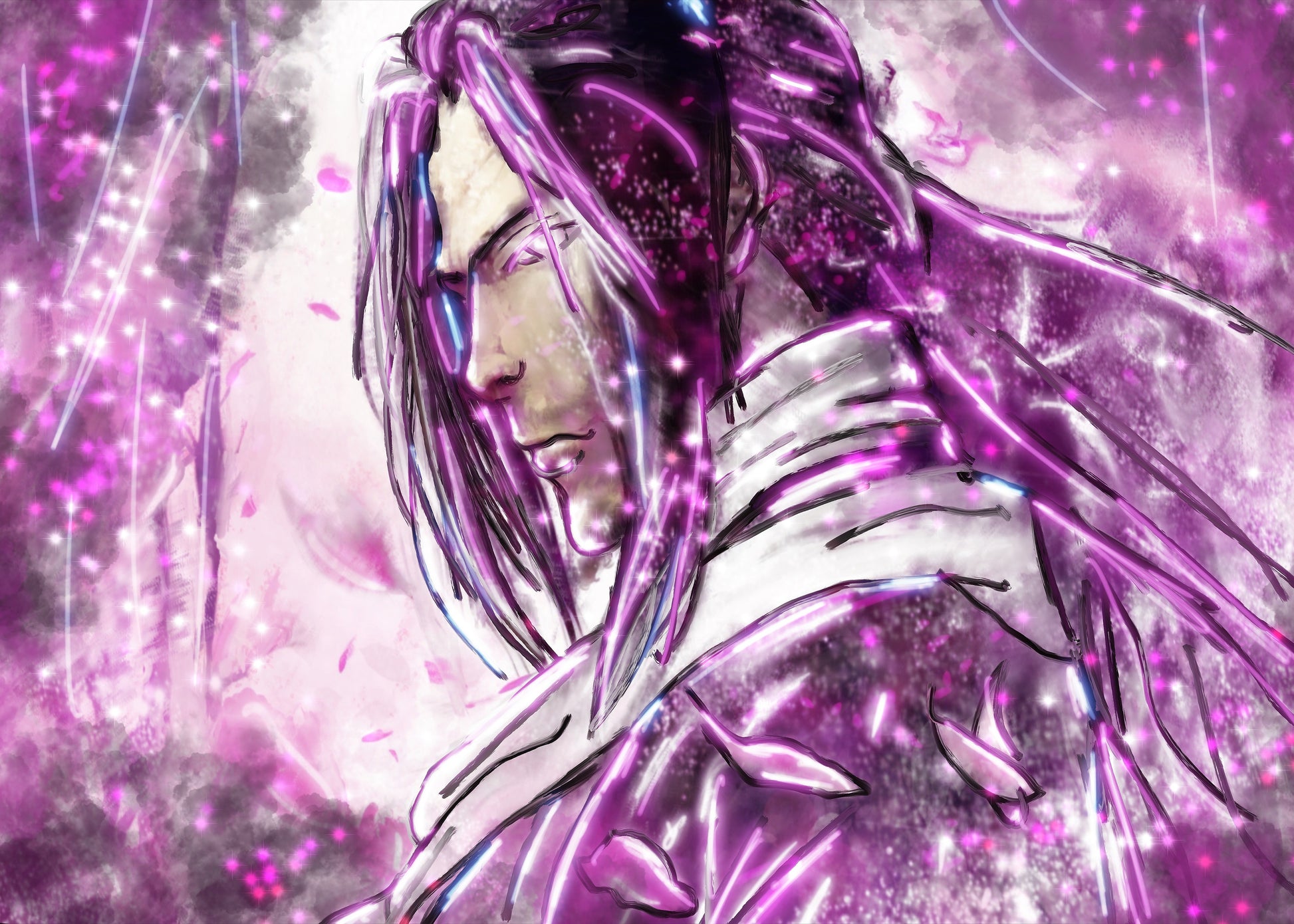 Holographic Poster - Printed on 8.5"x11" 130lb. Cardstock, these posters are dipped in holographic foil prior to printing. This enhances all of the darker tones in each painting (especially the line art), bringing subtle shards of iridescent colors when hit with direct light. This lighting can be either from direct sunlight or an LED light. Avoid displaying in rooms that are damp or generate moisture.