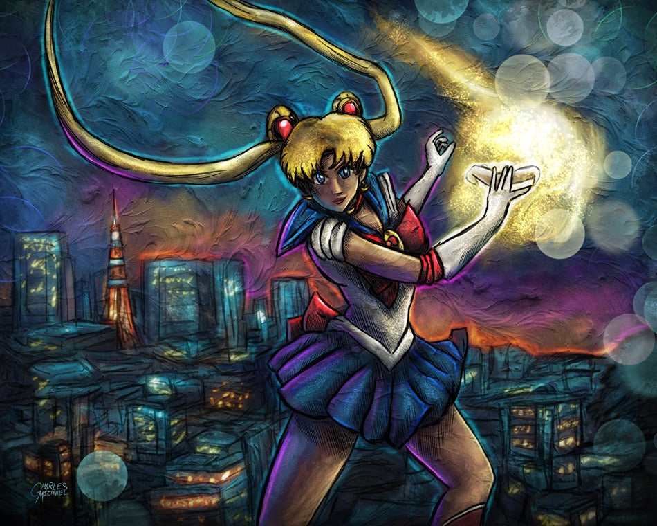 Holographic Poster - Printed on 8.5"x11" 130lb. Cardstock, these posters are dipped in holographic foil prior to printing. This enhances all of the darker tones in each painting (especially the line art), bringing subtle shards of iridescent colors when hit with direct light. This lighting can be either from direct sunlight or an LED light. Avoid displaying in rooms that are damp or generate moisture.