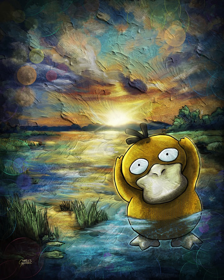 Holographic Poster - Printed on 8.5"x11" 130lb. Cardstock, these posters are dipped in holographic foil prior to printing. This enhances all of the darker tones in each painting (especially the line art), bringing subtle shards of iridescent colors when hit with direct light. This lighting can be either from direct sunlight or an LED light. Avoid displaying in rooms that are damp or generate moisture.