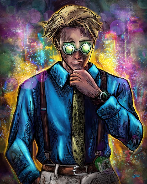 Holographic Poster - Printed on 8.5"x11" 130lb. Cardstock, these posters are dipped in holographic foil prior to printing. This enhances all of the darker tones in each painting (especially the line art), bringing subtle shards of iridescent colors when hit with direct light. This lighting can be either from direct sunlight or an LED light. Avoid displaying in rooms that are damp or generate moisture.