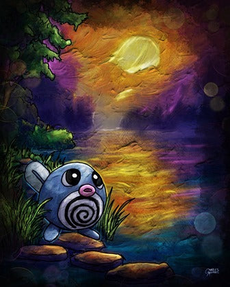 Holographic Poster - Printed on 8.5"x11" 130lb. Cardstock, these posters are dipped in holographic foil prior to printing. This enhances all of the darker tones in each painting (especially the line art), bringing subtle shards of iridescent colors when hit with direct light. This lighting can be either from direct sunlight or an LED light. Avoid displaying in rooms that are damp or generate moisture.