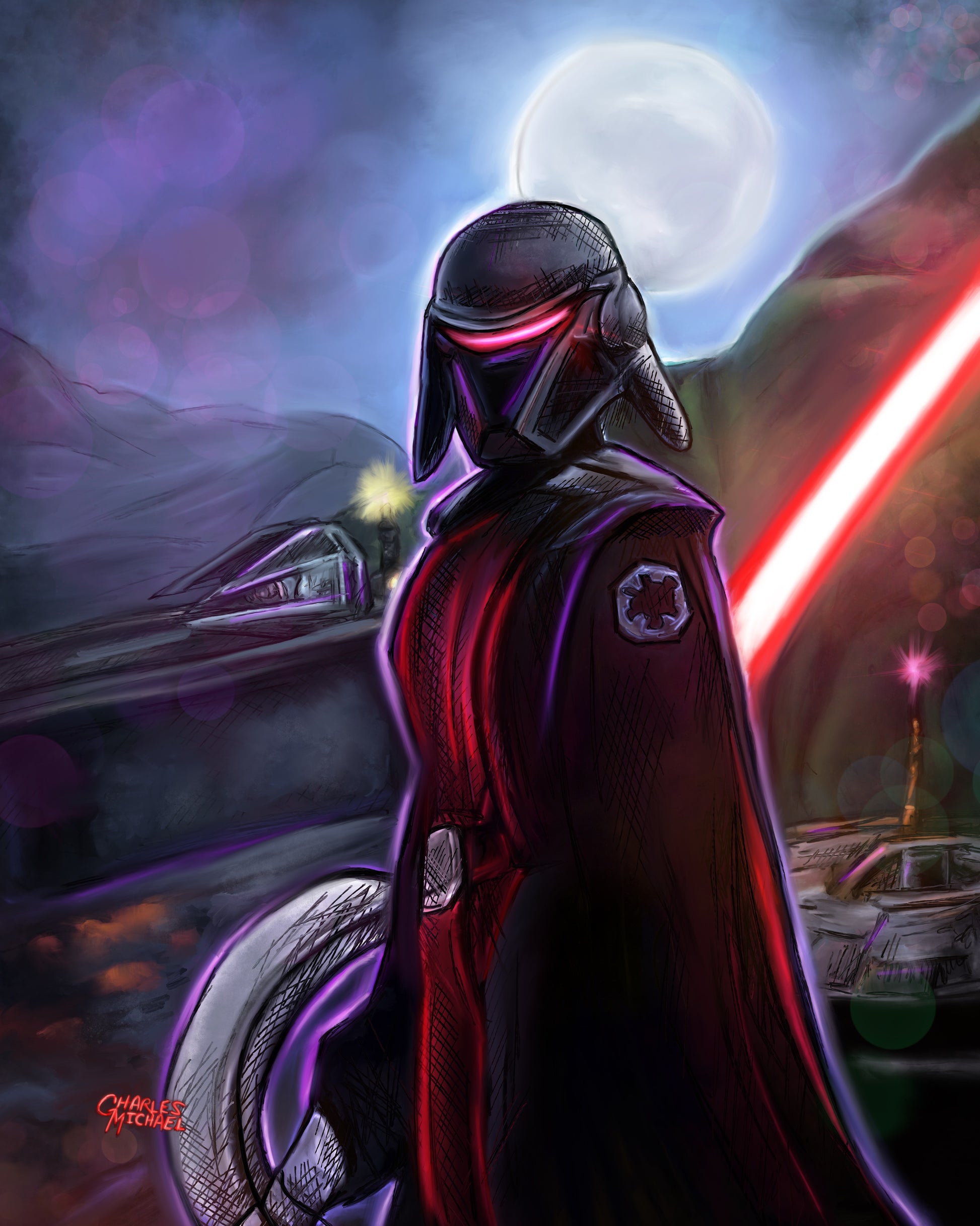 Holographic Poster - Printed on 8.5"x11" 130lb. Cardstock, these posters are dipped in holographic foil prior to printing. This enhances all of the darker tones in each painting (especially the line art), bringing subtle shards of iridescent colors when hit with direct light. This lighting can be either from direct sunlight or an LED light. Avoid displaying in rooms that are damp or generate moisture.