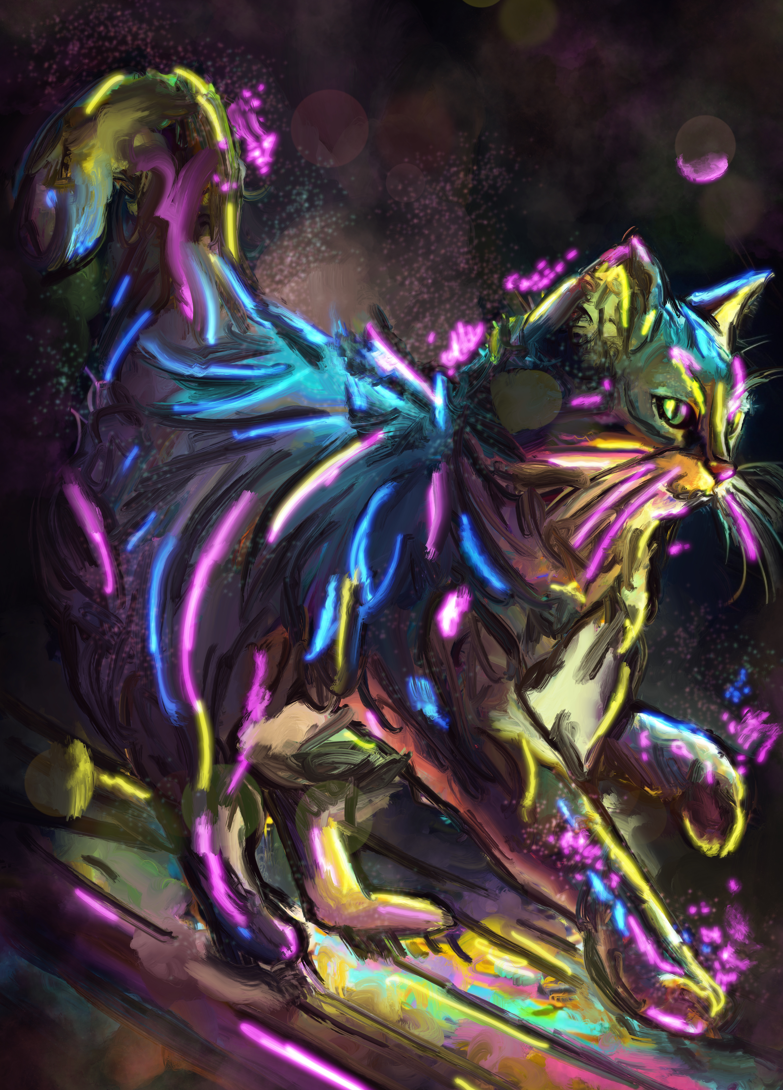 Holographic Poster - Printed on 8.5"x11" 130lb. Cardstock, these posters are dipped in holographic foil prior to printing. This enhances all of the darker tones in each painting (especially the line art), bringing subtle shards of iridescent colors when hit with direct light. This lighting can be either from direct sunlight or an LED light. Avoid displaying in rooms that are damp or generate moisture.